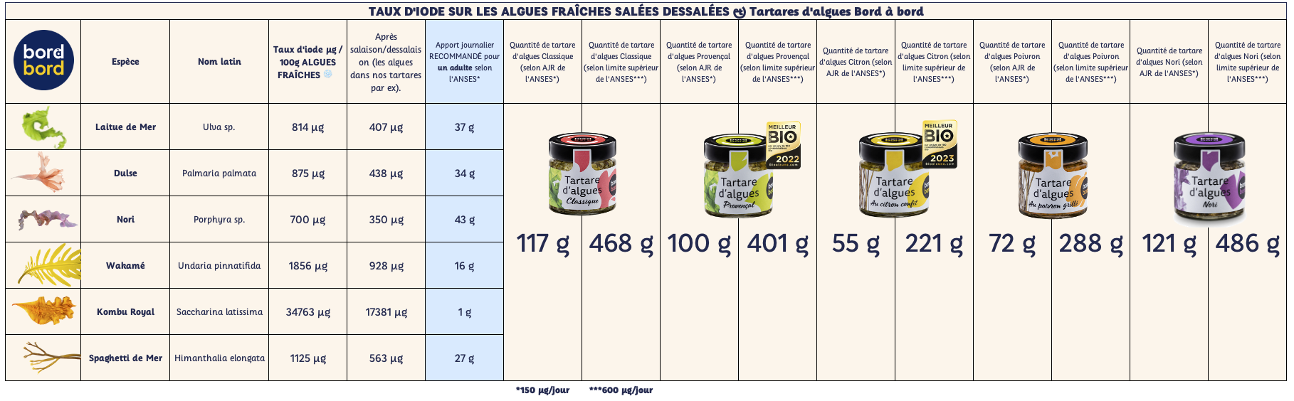 La salaison, la cuisson, le trempage en eau tiède, font baisser le taux d’iode significativement, nous l’avons intégré pour vous aider au quotidien (tableau 2). Chez Bord à bord, nous utilisons la technique de salaison qui baisse naturellement le taux d’iode pour nos recettes comme les tartares d’algues (tableau 3).