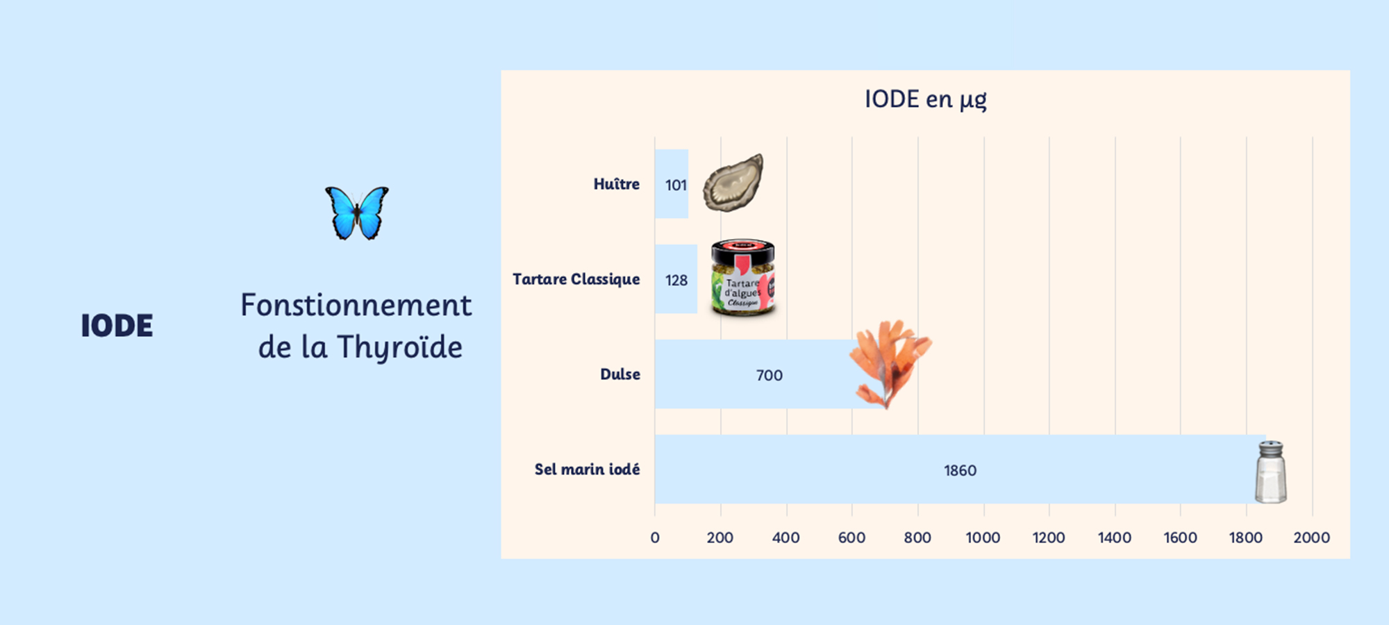 Cet article offre une vue d’ensemble sur l’iode dans les algues et ne constitue en aucun cas une recommandation nutritionnelle ou médicale. Les algues sont des végétaux remarquables, riches en composés nutritionnels intéressants. Cependant, nous vous conseillons de faire preuve de discernement face aux allégations souvent exprimées pour 100 g d’algues sèches sur différents supports (sites internet, articles de presse…)