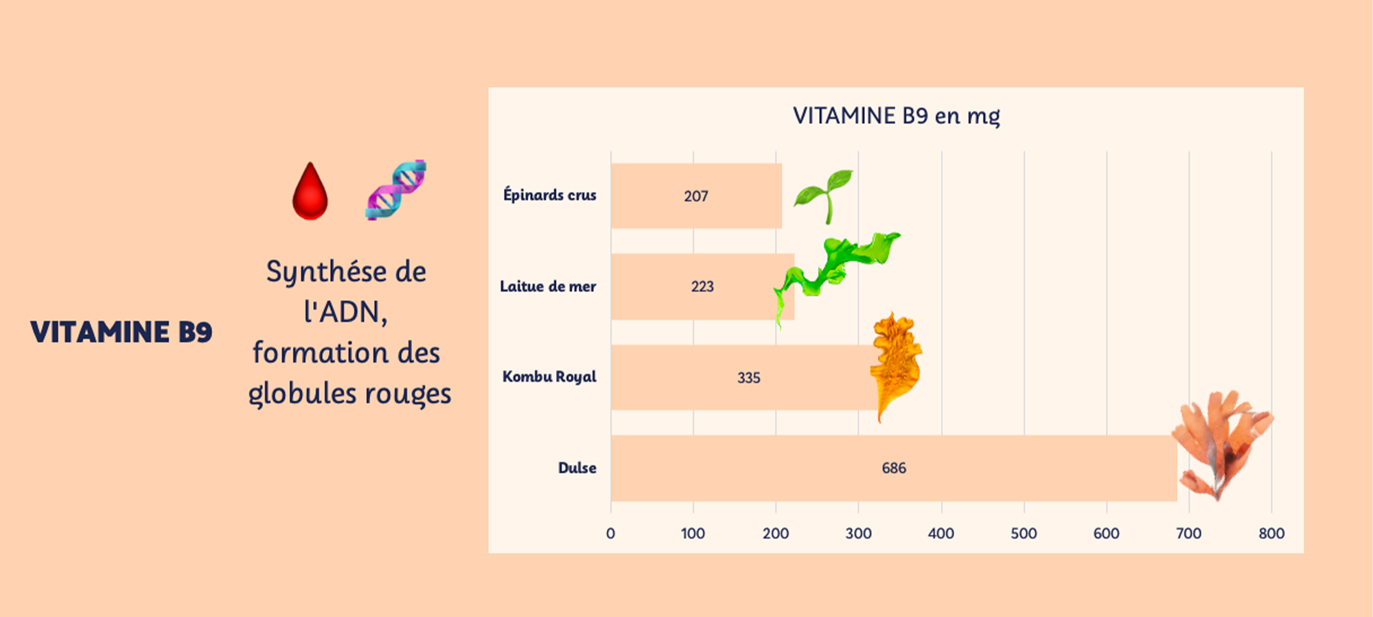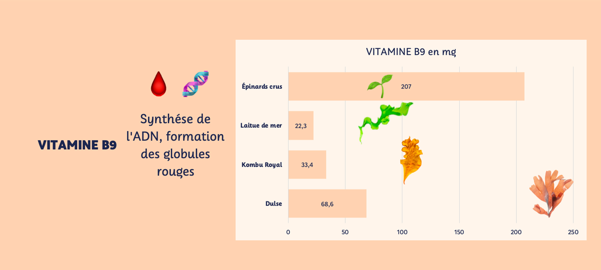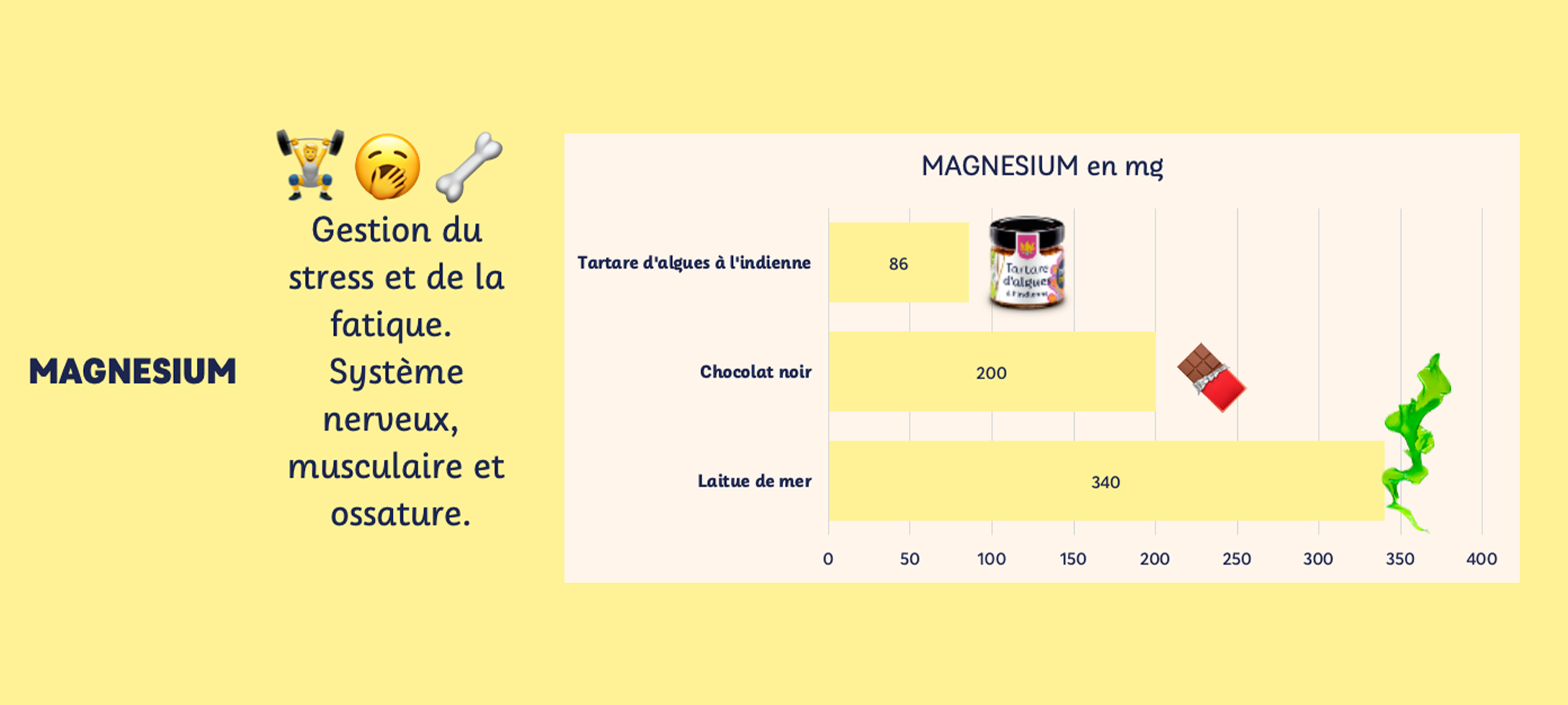 Ces concentrations sont présentées pour 100g d’algues fraîches, afin de refléter le potentiel nutritionnel des algues en comparaison aux autres aliments mais cette quantité est rarement consommée sur un seul repas (ou même sur une journée). Les quantités quotidiennes seraient plutôt autour de quelques grammes si vous utilisez les algues séchées à soupoudrer (comme notre Mélange 3 algues) à quelques dizaines de grammes si vous vous régalez d’une tartine de Tartare d’algues ou de nos Gwak’amole.