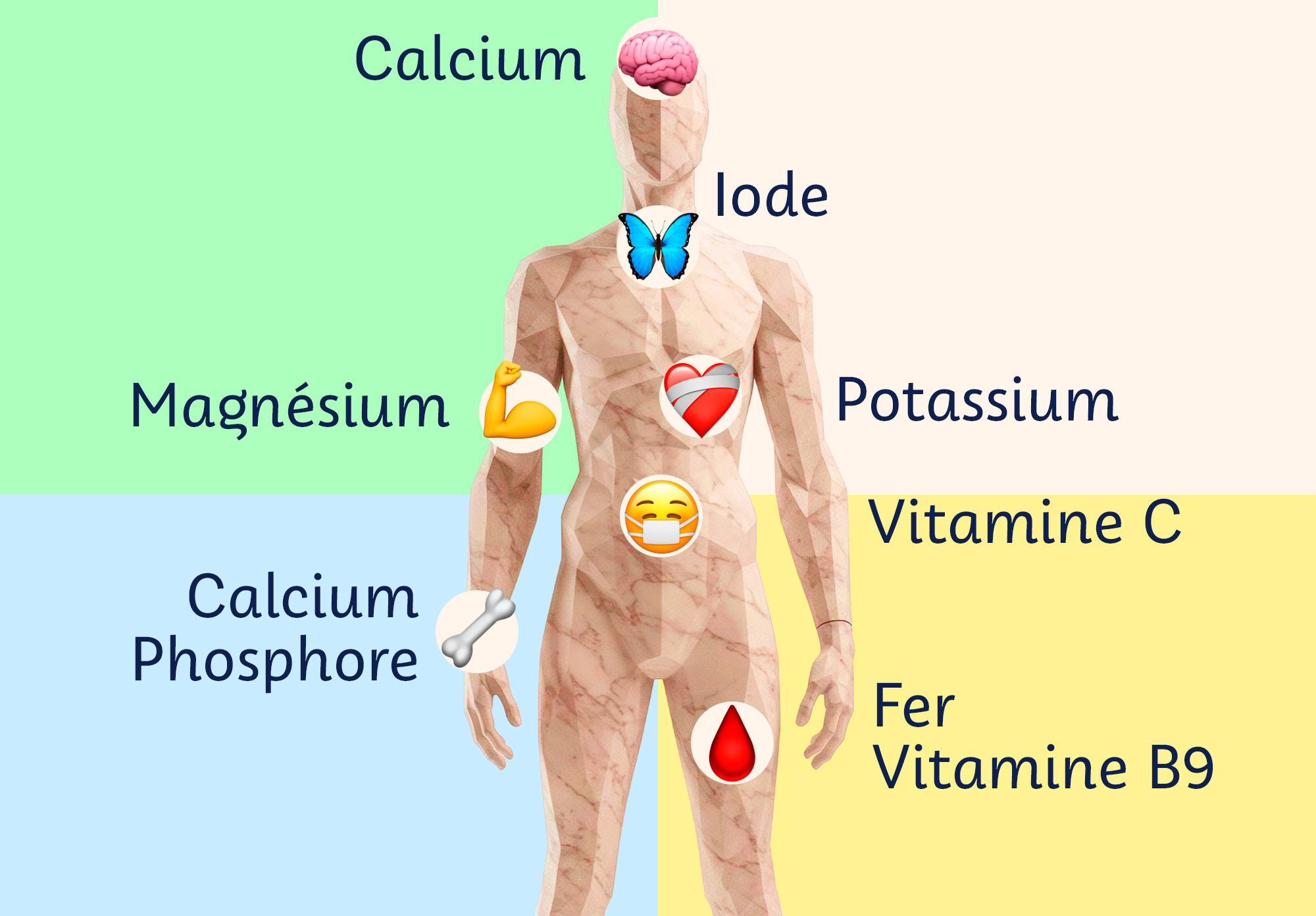 Bien qu’ils ne soient pas des composés organiques comme les vitamines (composés d’atomes de carbone et d’hydrogène), les minéraux doivent également être apportés par l’alimentation car notre corps ne sait pas les synthétiser. Ils se divisent en 2 catégories : les macroéléments (présents en plus grande quantité) rassemblant le calcium, le magnésium, le potassium ou encore le phosphore, et les oligo-éléments (présents à l’état de trace) regroupant le fer, le zinc, l’iode, etc…