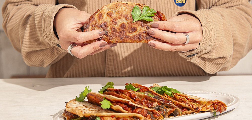 - Ajouter une cuillère de tartare poivron et une portion d’effiloché buffalo sur un côté de la tortilla.